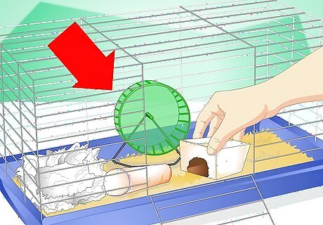 Jazz up the habitat. Beyond bedding, your hamster will need toys and places in which to hide and sleep. Decorate the tank or cage to promote your hamster’s health. Place an exercise wheel in the habitat. Hamsters love to play and the wheel will allow them to run around and get exercise. It should be large enough to where the hamster doesn't have to arch it's back to run on it. Incorporate a small box or item such as a flowerpot where your hamster can sleep and hide. Cardboard tubing, such as a toilet paper roll, is also a great option. Include a chew toy for your hamster made out of a safe material such as unpainted wood, dog biscuit or rawhide. Like other rodents, hamsters’ teeth grow continuously and having something on which to chew can wear down their teeth and keep them healthy. Get several toys and place them in your hamster’s habitat to keep her busy and happy.