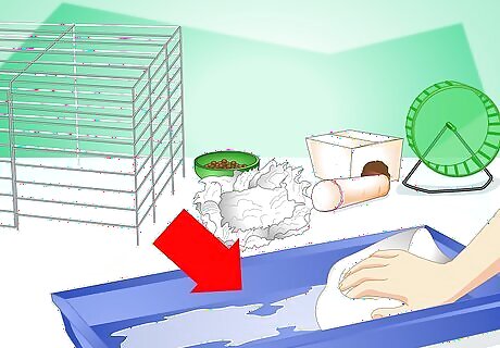 Replace the bedding. Your hamster will urinate and defecate usually on one spot of her bedding. You can remove soiled areas daily but you should replace all of the bedding at least once a week. This minimizes the risk of infection and reduces odor. Remove any soiled areas of bedding and droppings every day. Your hamster may use the same spot to urinate and defecate so focus cleaning and removal on that spot as a part of daily cleaning. Make sure to replace any soiled paper towels or tissues. Clean and disinfect the habitat walls and floor at least once a week and more often if needed. You can use a disinfectant or a vinegar and water mixture. Allow the habitat to dry thoroughly before you replace any bedding, toys, or dishes. This prevents the growth of bacteria or ammonia that can harm your hamster.