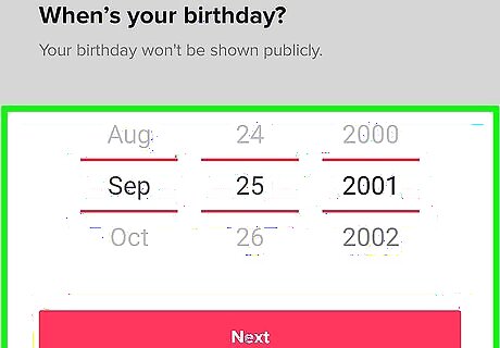 Enter your birthday. Enter the year, month, and day of your birthday when prompted, and then tap Next to move forward. Nobody on TikTok will be able to see your age or birthday—this is just for account creation. Note: If you're under 13 years, ask a parent or a guardian to help you out. Let them know that you're downloading TikTok. You can also convince them if they are adamant.