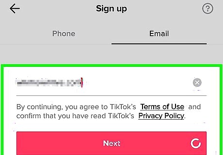 Enter your phone number, email address, or login details. If you're signing up with a phone number or email address, type in a phone number or address you have access to, and then create a password that contains between 8 and 20 characters. If you're signing up with Google, Twitter, or Facebook, enter your login details for that site, and then follow the on-screen instructions to give TikTok permission to use your account. Don't worry, you can still create a unique username!