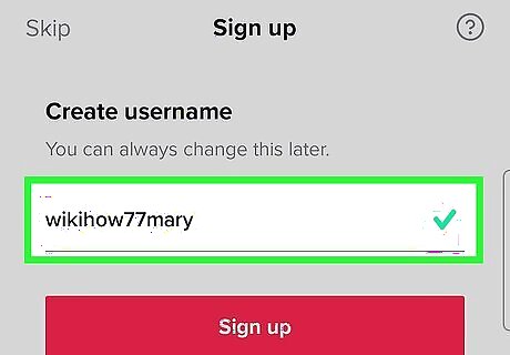 Type a catchy name to use on TikTok. This is the name people will see when they view your TikToks or see your comments. Be creative! If you signed up with Google, Facebook, or Twitter, a username will be created for you. You can change it, though! Just tap Profile, select Edit profile, tap Username, and then enter your new name. Don't forget to hit Save when you're done!