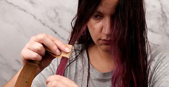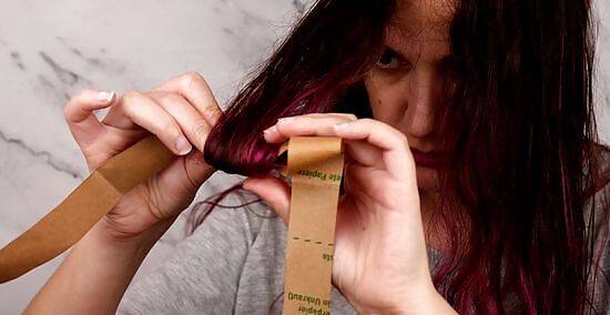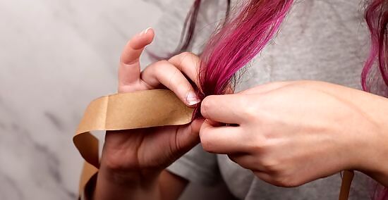 Wrap a strip of paper around your hair. For best results, use about 1-inch sections of hair. Place your damp hair, or your hair with product, in the middle of the paper strip and fold one side of the strip over, so that your hair is sandwiched between the two sides. Then, slide the strip down to the bottom of the section of hair, so that you’ll be able to roll up the entire strand.