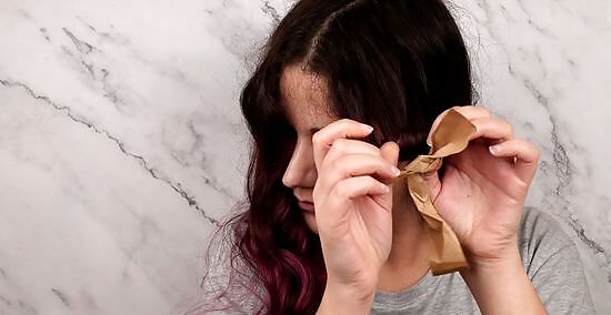 Unwrap each curl. Once you’ve felt your curls and determined your hair is completely dry, it’s time to untie your paper bags. Gently undo each knot and slowly unravel your rolled hair. Do this for your entire head. When you think you’ve untied them all, run your hands through your hair to ensure there isn’t any paper left in your hair. Keep a recycling bin near by so you can toss your paper strips into it as you remove them.