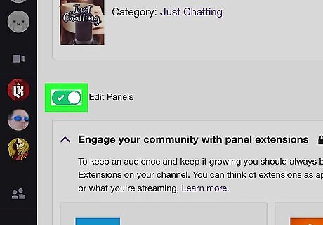 Add info panels. These panels show up on your channel and create the opportunity to involve your guests. To add or edit panels, tap the switch to the on position next to the text Edit Panels, which you can find under your broadcasting video. You’ll first see a list of panel extensions. These are already created panels you can use, generally free of charge. Tap the name of a panel extension you are interested in, then tap Install. To create your own panel, scroll down to the blank box with the plus sign (+) inside. Tap that box and Add a Text or Image Panel. You can see the Twitch guide on markdown basics to format or add additional images to your panel.