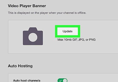 Edit your video player banner. This is an image that displays on your channel when you’re offline. To edit your video player banner, you’ll need to tap on your profile image for the drop-down menu, tap Settings, then tap the Channel and Videos tab. Tap on Update in the Video Player Banner header. Twitch recommends uploading an image that’s 1920x1080px with important images or text near the center.