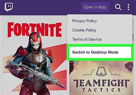 Tap Switch to Desktop Mode. The page will load in the Desktop version. You may need to confirm which app you’re going to use, like Safari or Chrome. Do not open Twitch in the app.