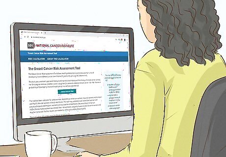 Take a breast cancer risk assessment for a 5 year and lifetime estimate. There are online tools available that can help you to get a rough estimate of your risk. A test will ask you questions about your health history to determine how likely it is that you will develop breast cancer within the next 5 years and how likely it is that you’ll develop breast cancer in your lifetime. Go to https://bcrisktool.cancer.gov/ to complete a quick online assessment of your risk factors and be sure to discuss the results with your doctor. Keep in mind that this tool only provides an estimate of your risk. It is not a prediction of whether or not you will get breast cancer.