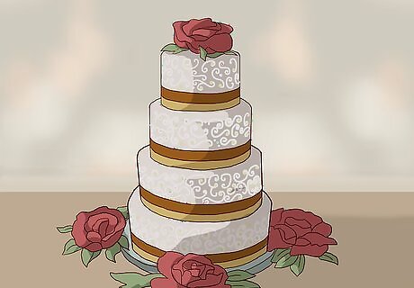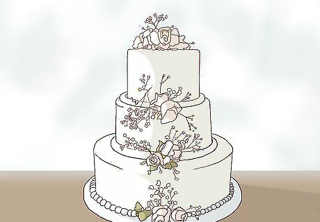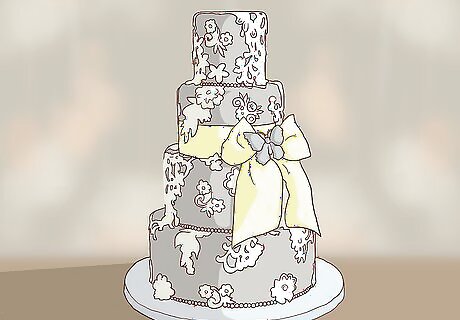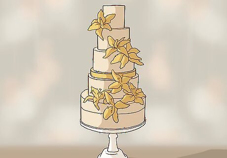 Go for drama with gold or silver. If you want to keep it simple, consider using gold icing on the cake. Use metallic elements to accent, such as gold or iridescent colored rosettes made of icing. Gold icing can be hand painted onto your cake for a very elegant look. If you prefer silver, start with a white cake and create all of the accents in silver. Make one of the tiers silver or go all out and gild your entire cake. Consider the color theme of your wedding. If you are using warm colors like deep red, chocolate brown and cream, accent with gold. If you're using cool colors like ice blue and bright white, accent with silver.