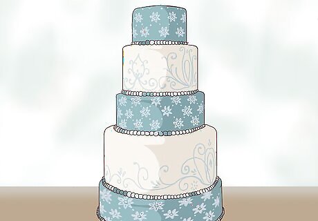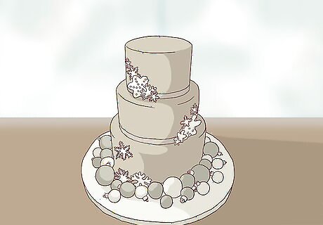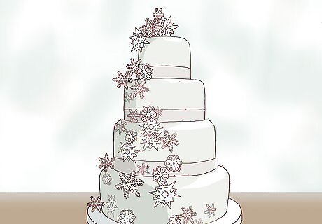 Select an all-white cake. A stark white wedding cake with all-white accents can make a beautiful wintry impression. White frosting can create a stunning snowy effect and there are countless ways to feature this look. For example, you could have a several-tier cake with white buttercream frosting to mimic snow. Scatter edible snowflakes made out of fondant icing on top of the tiers. Dust the cake with sparkling sugar to create the effect of glittering snow. For a unique look, consider accenting with icicles made out frosting.