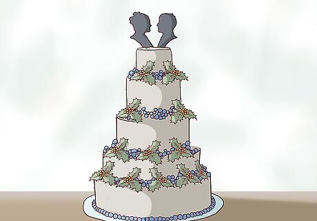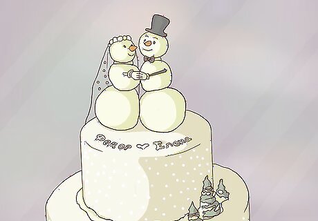 Use something untraditional for the topper. Instead of the typical bride/groom topper, go for something seasonal that matches your wedding's theme. A rustic wedding could have a topper arrangement created out of burlap, fresh herbs and cinnamon sticks. Tiny owl figurines can create a forest-like vibe or tiny snowmen could represent the season. You could also top the cake with an elaborate arrangement of natural materials. Try a combination of pinecones, fresh herbs, twigs, berries, baby's breath and fresh flowers.