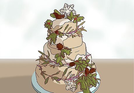 Choose rich reds and chocolate browns. If you'd prefer not to have a mostly white cake, you still have plenty of options. Have a chocolate cake, or alternate cream and chocolate tiers for an earthy vibe. Rich reds are also very seasonal and red accents look great on a chocolate cake. For example, you could place sprigs of red berries on the tiers. To enhance the Christmas vibe, put sprigs of holly around the red berries. For a less rustic look, line the tiers with red rosettes made of royal frosting or create a red stripe with a velvet ribbon.