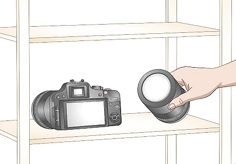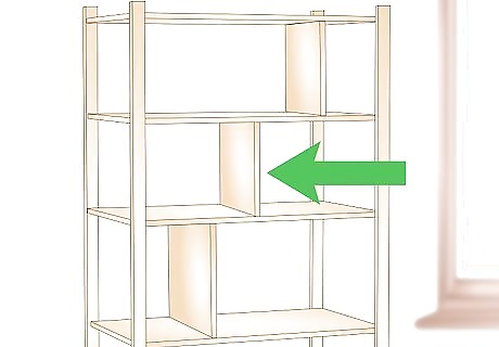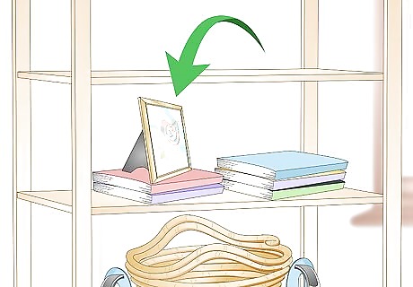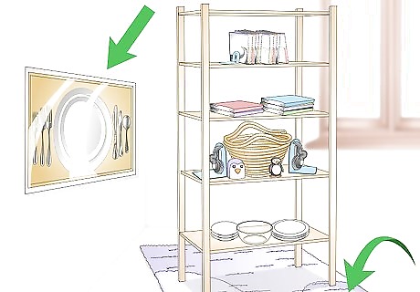 Simplify the decor if you display other items nearby. If you wish to place other eye-catching decorations nearby, make your shelves less of a focal point. To do this, store less items on the shelves. Choose mostly items with neutral colors, such as white. Keep your room balanced by not drawing attention from nearby decorations. For example, a fancy framed painting may be on the wall. If you don't move it, it will be the first item anyone sees when they step into the room.