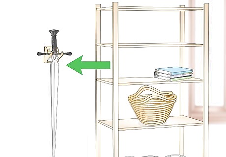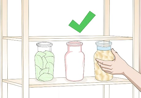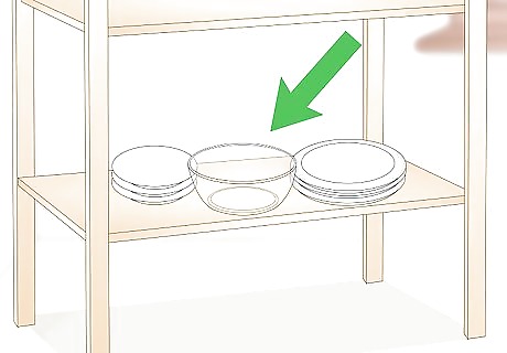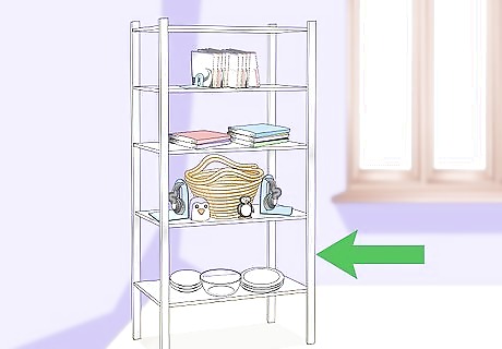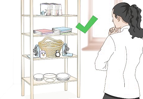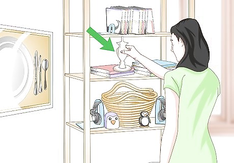 Arrange frequently-used items on lower shelves. Items you know you will need often, such as a specific bowl or personal object, belong on the lower shelves. This way, you don't have to dig through the decorations to get to them. Keep in mind which items need to be accessible as you organize them. The items you use less frequently can be stored on higher shelves that aren't as easy to access. Take shelf balance into account. Large items may look too noticeable up on the top shelf. Also, these items can be tough to remove safely from high shelves.