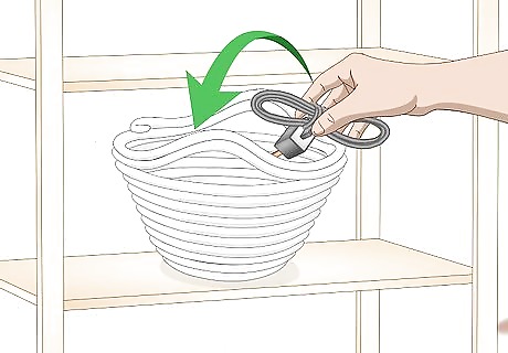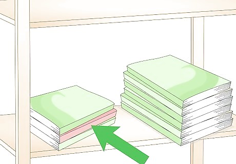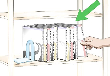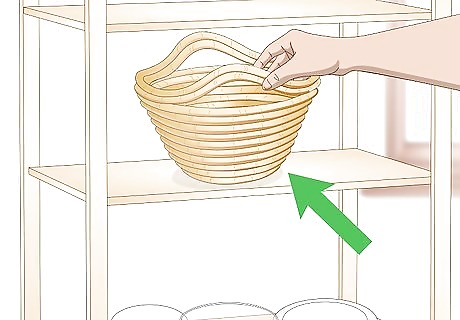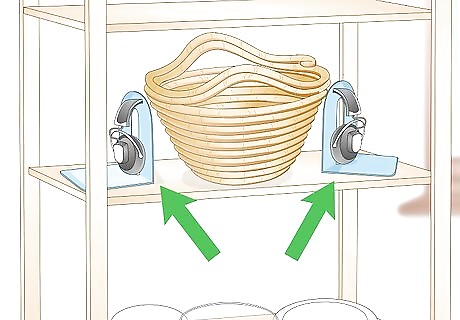 Hide clutter in baskets. You may end up with a collection of items overcrowding your shelves. Consider replacing these items with a basket. Baskets are available in a variety of styles, so they are easy to incorporated into your decor. Then, use them to keep your shelves neat and organized. Baskets are also a good way to store items you don't want on display, such as cables from electronic devices. Use baskets to store extraneous objects like extra blankets or mail. Typically, baskets look best on lower shelves. If you use the items in the baskets frequently or if they're heavy, be sure to put them on the lowest shelf.
