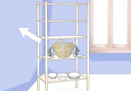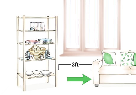 Move furniture at least 3 ft (0.91 m) away from the shelves. Leave some walking space between the shelves and furniture. Also, after the work you probably went through in arranging the shelves, you won't want to obscure the decor behind a large couch. Move furniture away so the shelves are visible. Placing a large chair near a shelf can be distracting. The size of the chair draws eyes to it, so your shelves will likely be underappreciated. If you want furniture near the shelves, restrict it to a single small chair if possible. Or, make sure the furniture is a solid or neutral color so the area doesn't look too busy.