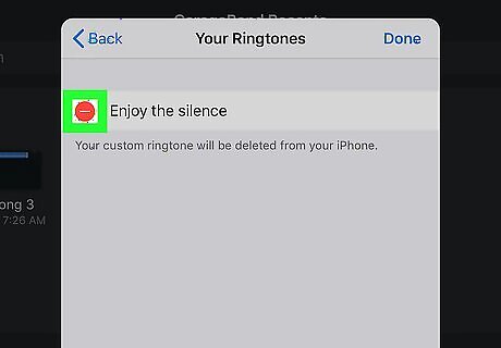 On the top left corner, select the upload symbol. It looks like a square with an arrow pointing upwards from it. From the pop up menu that appears, select Ringtone from the bottom. (If it warns 'Your ringtone length needs to be adjusted,' select Continue.) From the window that appears, select Your Ringtones from the bottom. On the top right of this window, select Edit. The ringtones you created with GarageBand will have a red minus sign in front of them.