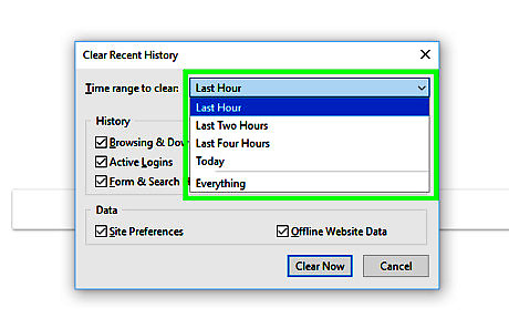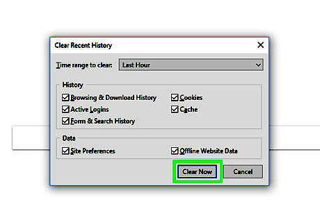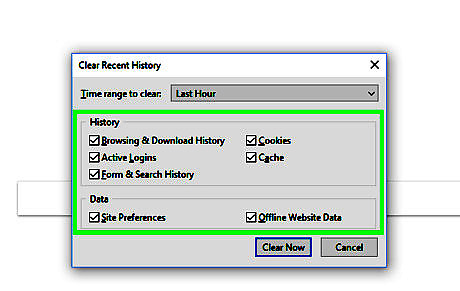 Decide what you want to clear. You can only clear certain things, like cache or browsing history, or clear everything. Below is a description of what each of the options will clear: Browsing & Download History: Selecting this option will clear the list that contains of all the sites that you have visited, and it will clear the log of the files that you have downloaded (it won't delete the downloaded files themselves). Cookies: This option will remove all cookies that are stored on your computer (clearing cookies may log you out of your accounts). Active Logins: This option will log you out of all accounts that are currently set to remember you. Cache: Selecting this option will delete all cache that your browser has stored, you may need to do this if a website is not working correctly. Form & Search History: This option will remove the history and suggestions that pop up when you type things into text boxes. Site Preferences: Selecting this option will clear Firefox's memory of things like zoom on certain websites, sites that are whitelisted on your pop-up blocker, and whether or not you want to save passwords on sites (selecting this will not erase your saved passwords). Offline Website Data: This option will delete any files that a website has saved on your computer. Websites can only save offline website data if you have allowed it.