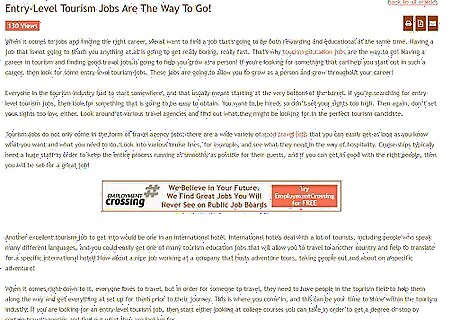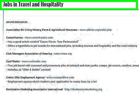Research jobs related to tourism. The tourism industry encompasses many different career opportunities, with varying degrees of experience required. Some examples of these job opportunities include travel planning, serving on resorts and cruise ships, hotel management, and travel writing. Look up travel industry websites and career guides online to get more information.