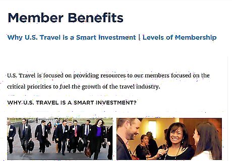 Join a professional association for people in the industry. Look into joining a professional association for travel and tourism, which could include any organization dedicated to stimulating and improving the industry. This can be a way to network and gain contacts that may benefit you in your tourism career. Becoming a member of this kind of association will grant you access to events, conferences, and lectures relevant to the industry. Visit the U.S. travel association’s website for an example of a professional tourism association: https://www.ustravel.org/membership/member-benefits