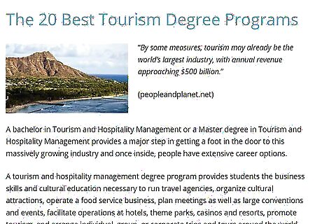 Consider getting a tourism-related degree. If you wish to further your training qualifications, consider getting a degree in something like travel and tourism management, tourism and hospitality management, or tourism and event management from a college or university (usually in a school’s hospitality or business departments). Programs will range in scope between institutions, but generally encompass courses in human resources, financial strategies, media relations, and facilities management. Some programs offer (or require) internships with tourism-related companies before graduation. Some careers available to individuals with this training are: travel agents convention and event planners travel coordinators lodging managers