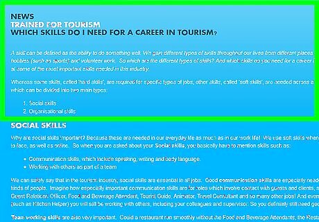Improve your job-related skills. Consider working on career-related skills that could benefit you in a tourism industry career, such as accounting, word processing, or website design. Take classes if possible, or invest time in teaching yourself with the aid of books, manuals, or reputable online resources. While they are very useful in the tourism sector, many of these skills are universally valuable in the job market.