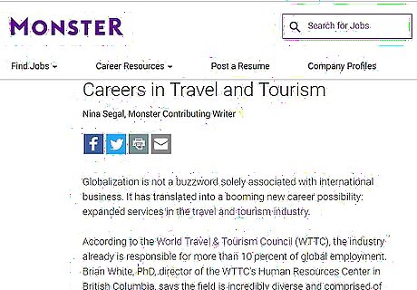 Look at industry trends. Looking at trends in the tourism industry is a good way to evaluate the current job market, as well as future job opportunities that may be available. Tourism-related websites have created new job opportunities in the industry, ranging from content writing to website design. Aiming for a job in the growing internet component of the industry is a way to stay ahead of the curve at this juncture.