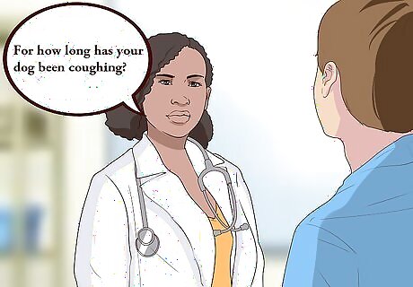 Answer your vet’s questions about the coughing. In addition to the initial history you provide, your vet will ask you questions to develop a list of possible coughing causes. Examples of questions your vet may ask include: For how long has your dog been coughing? Does your dog have trouble breathing? Have you taken your dog to a groomer or boarding facility recently? Have you noticed weight gain or loss in your dog? Does your dog seem more depressed or restless?