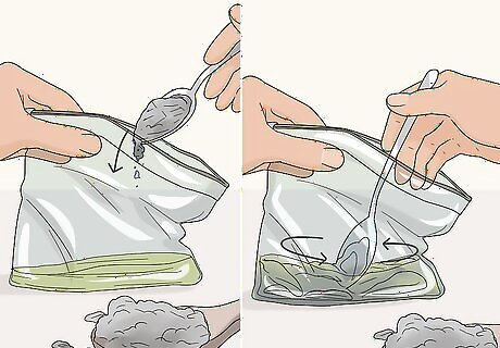 Mix inedible material with the medication. Mixing your unused or expired medication with another material deters animals or other people from ingesting it. Put in a few spoonfuls of something like cat litter, used coffee grounds, dirt, or ash into the bag and mix it together with the medication. Once you thoroughly combine the material and medication, seal the bag tightly so it doesn’t open. You can also add salt or flour to disguise the medication. Adding material will help hide the medicine so others don’t know what’s inside the bag.