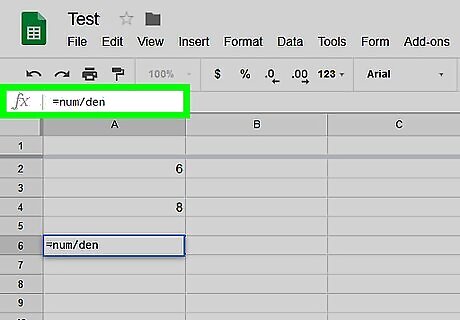 Enter =num/den into the empty formula cell. This is the simple division formula, which will make an exact calculation for you. In the division formula, num represents your numerator, and den represents the denominator.