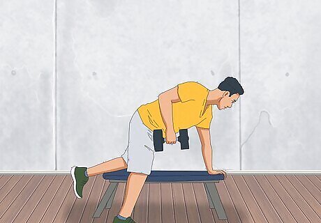 Complete a single arm dumbbell row. If you have a lower back injury, substitute single arm dumbbell rows for bent over barbell rows. Instead of relying on your body for balance and support, use a bench. Place your bent left knee on one end of a bench and your left palm on the other end of the bench. Position your right leg near the edge of the bench with your foot firmly planted on the floor. Allow your right arm to hang. Keep your back parallel to the ground. Engage the muscles in your core. Grab the dumbbell with your right hand. Pull the weight up towards your chest—keep your elbow and upper arm near your ribs. Lower the dumbbell. Repeat 8 to 12 times. Place your right arm and knee on the bench and repeat this process using your left hand.