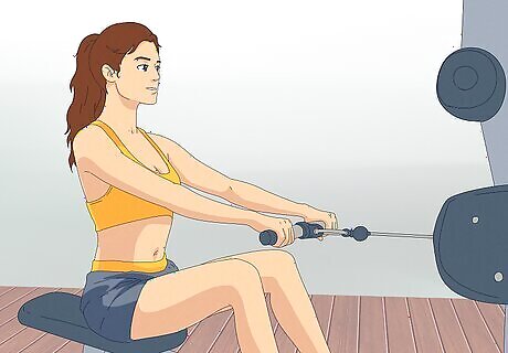 Complete a row on a low-pulley machine. Instead of executing a standing row, beginning weightlifters may wish to incorporate seated rows into their workout. The seated row affords newcomers with the opportunity to correctly learn the mechanics of a row. After selecting the weight you will lift, sit down on the machine’s bench. Set your feet firmly on the foot supports. Bend your knees slightly. Hinge forward at the hips and grab the two handles. Your palms should be facing each other. Lean backwards so that your back is perpendicular to the ground and your arms are fully extended. Engage your core muscles. This is the starting position. Pull the handles towards your stomach and lean back slightly. At the top of the lift (when the handles are nearest your stomach), squeeze your shoulder blades together to contract your muscles. Unbend your arms and return the handles to their starting position. Repeat.