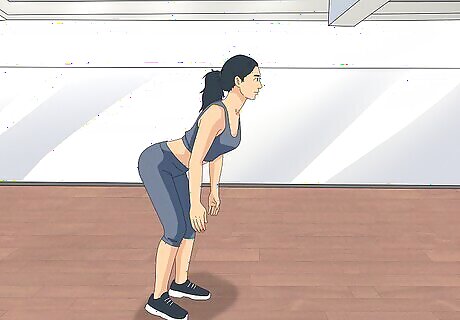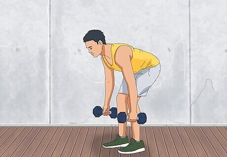 Complete a standing bent over row with dumbbells. Instead of using a barbell, you can execute a bent over row with two dumbbells. Grip a dumbbell in each hand. Stand with your feet shoulder-width apart with a slight bend in your knees. Lean forward at your hips, keeping your back straight, until your torso is at a 45° angle to the floor. Brace your core by tightening the muscles in your abdomen and lower back. As you pull the dumbbells up towards your chest, keep your elbows and upper arms close to your ribs. Lower the dumbbell. Repeat the lift 8 to 12 times.
