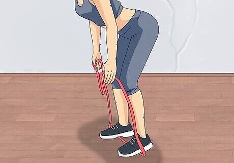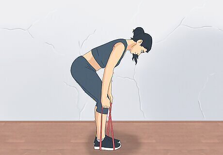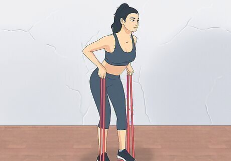Assume the correct stance. Bend the knees slightly and hinge forward at the waist. Your back should remain flat and parallel to the ground. Extend your arms under your shoulders and face your palms towards your legs. The band should be tensed from the starting position.