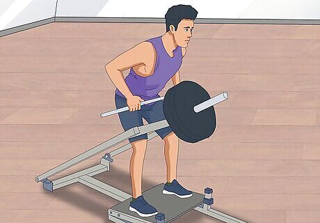 Complete a bent over row on a T-bar rowing machine. A T-bar rowing machine has two bars that intersect to form a lowercase “t.” The long bar, which runs parallel to your body, has a place for the weight plates at its top. The shorter bar, which perpendicularly intersects the long bar, is gripped by the lifter. To complete this lift: Straddle the T-bar rowing machine and place your feet on the foot supports. Hinge forward at the hips and bend slightly at the knees. Grip the T-bar and place your hands shoulder width apart. Engage the muscles in your abdomen and lower back. Raise the t-bar slightly off the ground. This is the starting position. Pull the bar up until it reaches your chest. Pause at the top and clench your shoulders together. Lower the bar until it reaches the starting position. Repeat.