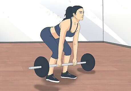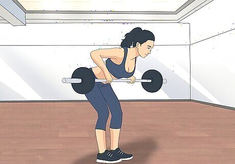 Assume the correct form. Place the desired weight on each end of the barbell. Stand in front of the barbell with your feet shoulder- or hip-width apart. While bending slightly at the knees, lean forward at the hips until your torso is at a 45° angle to the floor. Maintain the natural arch in your lower back. It is always better to underestimate rather than overestimate the amount of weight you can lift. Lifting too much weight can lead to injuries.