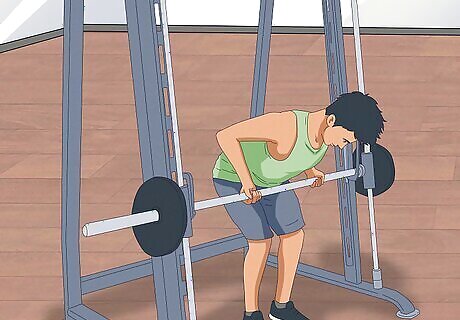 Complete a bent over row on a Smith machine. Executing a bent over row on a Smith machine is extremely safe. The barbell moves along vertical rails mounted to the machine and there are safety locks to prevent the barbell from slipping. When using a Smith machine, execute the lift as you would with a barbell. Place your feet shoulder width apart. Bend at the knees and hinge forward at your hips until your torso is at a 45° angle to the floor. Grip the bar with your hands slightly more than shoulder-width apart. Extend your knees slightly as you raise the bar to just below your knees. This is the starting position. Brace the muscles in your abdomen and lower back. Exhale as you pull the bar towards your chest. Keep your elbows and upper arms near your ribs and maintain the position of your back. Pause at the top and squeeze your back muscles together. Inhale as you lower the bar back to its starting position. Repeat.