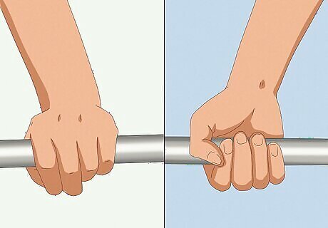 Experiment with different grips. Instead of executing a traditional bent over row with a barbell, try altering your grip to work a different muscle group or intensify your workout. Use an underhand grip. Instead of grabbing the bar from above, grip the barbell from below. When your palms are facing up, you take the strain off your back by forcing your biceps and lats to do more work. Use a snatch grip. A snatch grip is a double wide grip. This grip requires your back muscles to work harder.