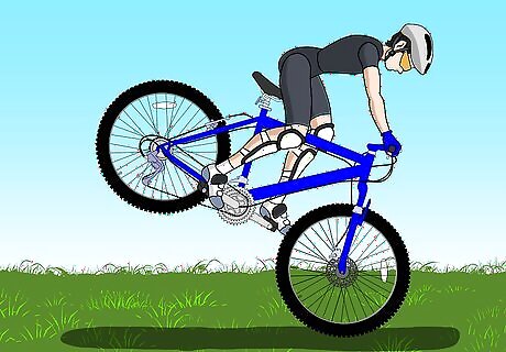Rock your weight forward while progressively squeezing on the front brake. Keep increasing the braking power until your rear wheel begins to lift. If you find that the rear wheel is pitching upward too quickly, release the brake immediately and move your weight rearward.