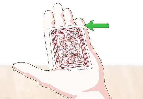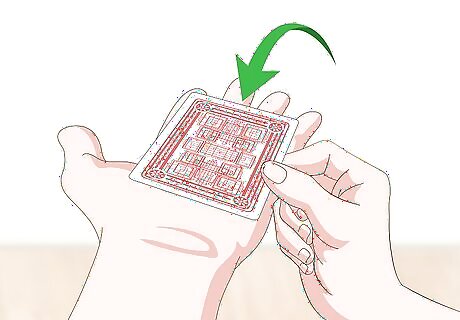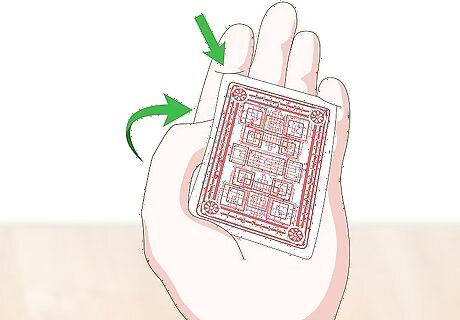 Hold 1 in the palm of your hand. Make sure you can’t see any edges or corners of the card when you flip your hand over. Place 1 corner of the card against the top of your pinky finger and the opposite corner on your thumb pad. You may need to slightly curve the card into your hand to rest in your palm. The card can be either face down or face up in your hand. Don’t grip too tightly or curl your hand inward too much. Keep it as outstretched as possible.