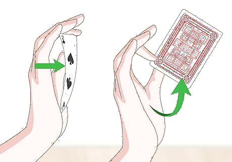Flick the card upward, catching it between your thumb and forefinger. Push up against the back of the card with your thumb. As the card flips upwards, pinch your thumb and index finger together quickly to snatch the corner. Open up the rest of your fingers after you flick up the card to enhance the illusion that you pulled it out of thin air. This will take a lot of practice, so be patient! As you get more comfortable with the movements, work on speeding it up so it looks more realistic.