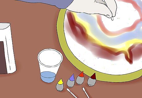Create patterns in milk. Pour milk into a bowl. Squeeze a drop each of different colored food coloring onto the milk without stirring. Dip a cotton bud into liquid dishwashing soap, and touch the end of the cotton bud onto the surface of the milk. Watch what happens to the colors. Turn this into an experiment by adding additional soap, one cotton bud at a time. At what point does the color become stable?
