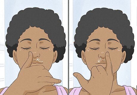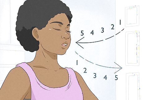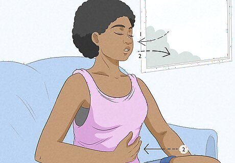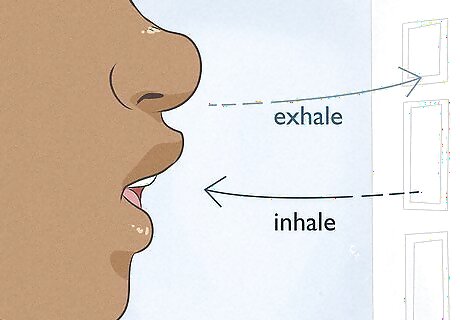 Press on your stomach and forcefully exhale through your nose. Sit upright and place your palms on your stomach. Close your eyes and take a deep breath in through your nose. When you exhale, quickly push your stomach in with your hands so a short, forceful breath comes out from your nose. Press down 10 times, exhaling each time. Try doing this for 2–3 breaths until you start feeling less stressed. You might feel slightly light-headed from this breathing exercise, but that’s normal. Just take a few more slow breaths in and out to feel better.