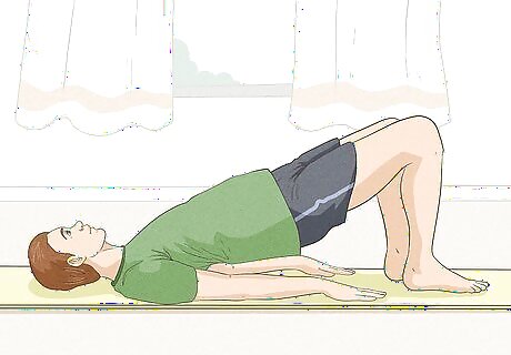 Do a bridge pose. Start by lying on your back with your knees bent and your heels as close to your bottom as you can get them. Put your arms straight down at your sides with your palms face-down. Take a deep breath in and on the exhale, press your arms and feet against the ground to lift your hips off the floor. Align your thighs so they form a straight line with your torso and hold your position for 30–60 seconds. Clasp your hands while you’re holding your position if you don’t feel like you have enough support. Avoid this pose if you have a neck injury unless you’re supervised by a professional.