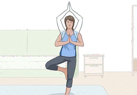 Perform a tree pose. Stand with your back straight and your feet shoulder-width apart. Lift your right foot and press your sole against the side of your left thigh. Put your hands in a prayer position in front of your chest, then straighten your arms up above your head. Take a few deep, calming breaths as you maintain your balance. On the final exhale, bring your hands back to your chest and plant your foot back on the ground. Then repeat the pose balancing on your right foot. Stand next to a chair or wall if you need to support yourself. Look straight ahead and focus on an object in front of you to help you maintain your balance.
