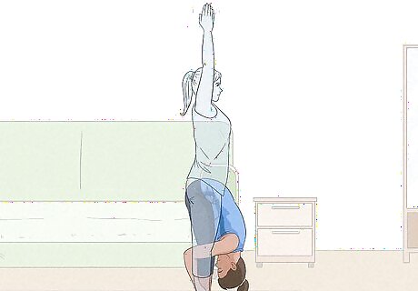 Lean forward at the hips to do a standing bend. You can go right into this pose from an upward salute. With your arms raised straight above your head, exhale and bend forward at the hips. Keep your legs straight and try to reach your ankles or feet. Hold your position for about 1 minute before standing up straight again. It’s okay if you can’t reach your ankles or feet. Just try to reach as far as you can and slowly walk your hands down your legs.