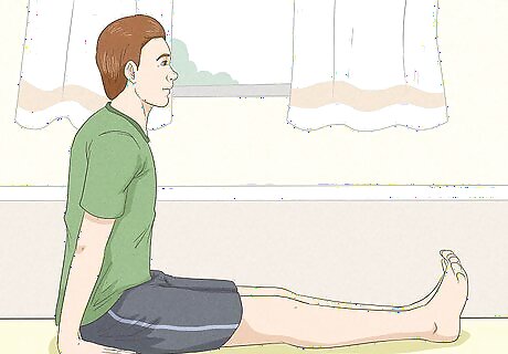Sit up straight in the staff pose. Sit on the floor and extend your legs out in front of you. Straighten your back and press your palms against the floor at your sides. Flex your thighs so you push them against the floor. Press your heels down into the ground as well. Hold your position for about 1 minute before relaxing. If you have trouble keeping your back straight, sit against a wall. Make sure you don’t touch your lower back or the back of your head against the wall.
