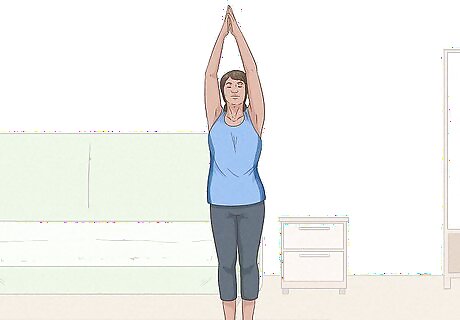 Do an upward salute. Stand with your feet shoulder-width apart and your arms at your sides so your palms face out. As you inhale, raise your arms straight up toward the ceiling. Touch your palms together above your head and reach straight up to feel the stretch. Keep your shoulders relaxed and your back straight as you’re performing this pose. If you can’t touch your hands together without hunching your shoulders, keep your arms parallel to each other instead.