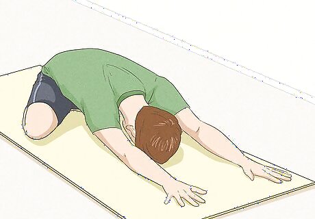 Do the child’s pose. Start on your hands and knees so your arms are directly below your shoulders. Walk your hands forward so they’re stretched out in front of you. Spread your knees slightly wider than shoulder-width and touch the tips of your toes together. Take a deep breath in and look forward. As you exhale, push your hips backward so your sit bones touch your heels. Keep your arms extended in front of you and rest your forehead on the floor. Hold your position for a few breaths before easing out of the pose. Try rocking your weight from one leg to the other to deepen your stretch. If you can’t reach your heels with your sit bones, just drive your hips back as far as you can.