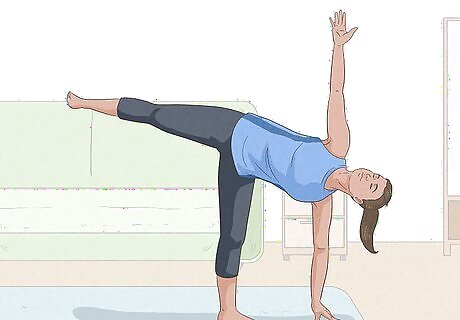 Get into a half-moon pose. Take a big step forward with your left leg to get into a lunge position. Keep your right leg extended straight out behind you. Slowly lift your right leg off the ground. Rotate your hips to the right so the right side of your body points to the ceiling. Extend your right arm straight up and keep your left hand planted on the floor to support your weight. Hold your position for 5 breaths before relaxing. Then repeat the pose extending your left leg behind you. This pose may be tricky if you have trouble balancing on one foot.