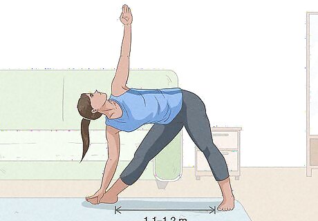 Try the extended triangle pose. Stand with your feet about 3 ⁄2–4 feet (1.1–1.2 m) apart. Rotate your right leg to turn your foot 90 degrees. Then turn your left foot so it points to your right foot at a 60-degree angle. As you exhale, bend to the right at the hips and touch your right hand against the floor just behind your right foot. Keep your left arm straight up and turn your head to look at it. Hold your pose for 5–10 breaths before slowly easing your way back into a standing position. Then repeat the stretch on your left side. If you have neck problems, don’t turn your head up while you’re in the pose. It’s okay if you can’t reach the floor. Just try to hold onto your calf or ankle instead.
